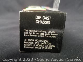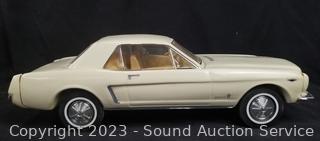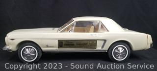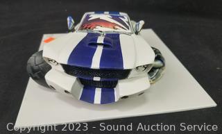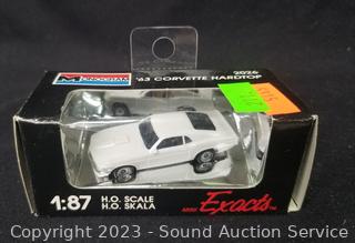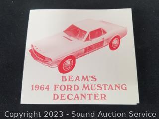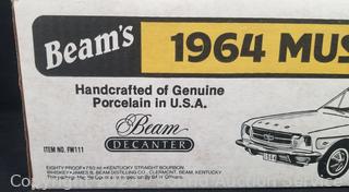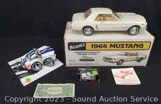 Car art sculpture is initialed TR by Country Artists, 8" x 8". 1:87 scale '63 Corvette Hardtop, Jim Beam 1964 Mustang Hardtop Porcelain Decanter, comes in original box.