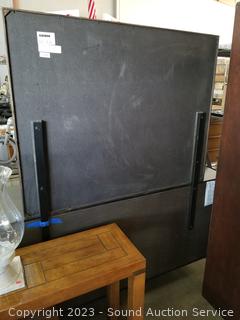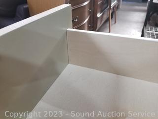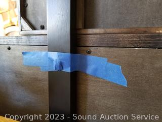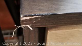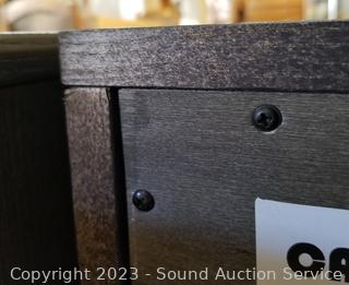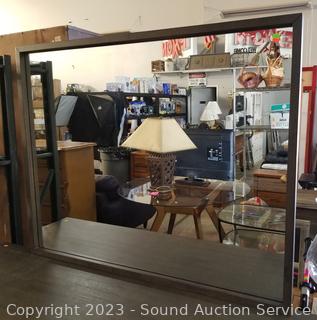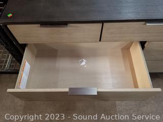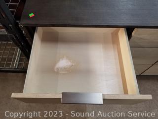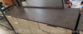 Front left corner has some damage, bottom right bolt for mirror not screwing in, currently taped on. Otherwise in great condition. Ball bearing drawer guides, soft close drawers. Wood veneer grey finish. 33" H x 68" W x 19" D with 38.75" H x 48.5" Mirror.