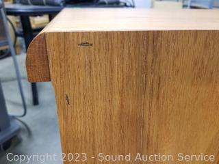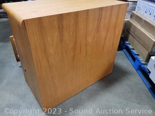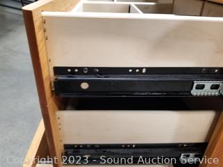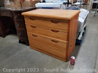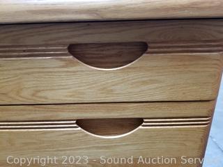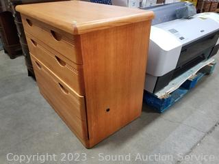 2 drawers are divided, lower drawer is a file drawer locking, with keys. In excellent condition. 29" H x 33.5" W x 19.5" D.