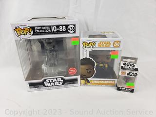#438 Bounty Hunters IG-88, Boba Fett Keychain, #240 Lando Calrissian. All in original packaging.