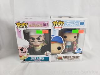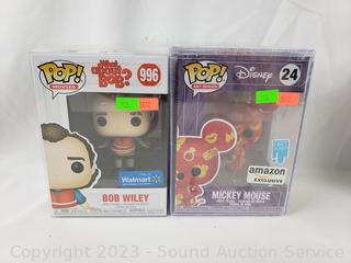 The Little Mermaid #567 Chef Louis, Disney #24 Mickey Mouse, Funko #60 Skater Freddy, What About Bob? #996 Bob Wiley. All like new in original packaging.