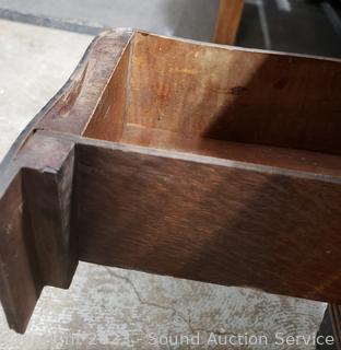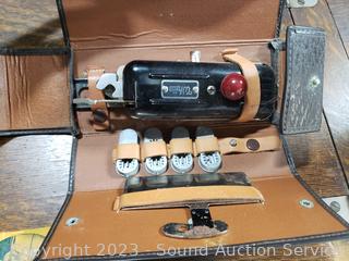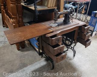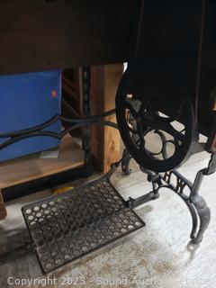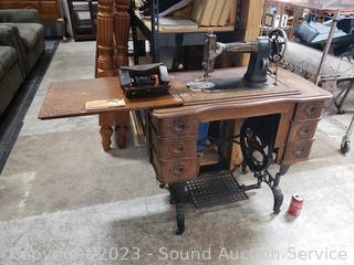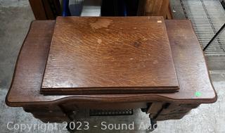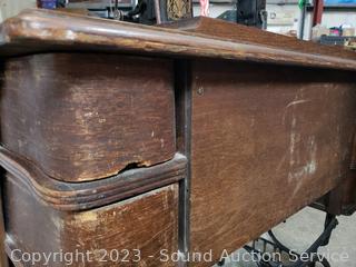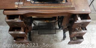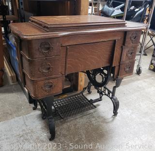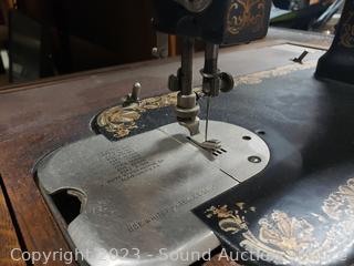Last patent date June 3, 1913. Serial FR2921529. Belt is a little loose, but does appear to be functioning. Comes with bobbins, buttonholer, oil. Antique tiger oak finish, various cosmetic wear. 30" H x 33.5" x 17.5".