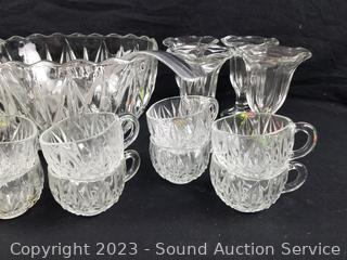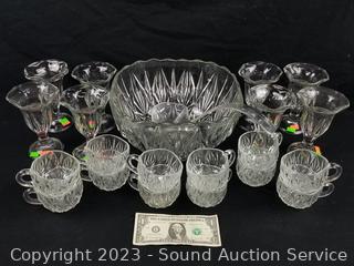 Lot #0094u: Clear Glass Punch Bowl w/12 Cups & 8 Milk Shake Glasses