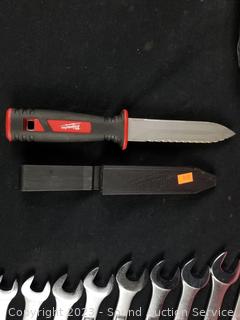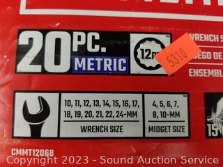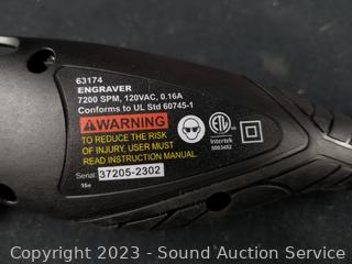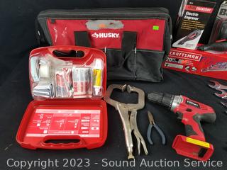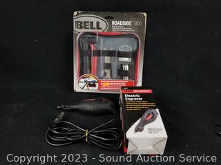 Craftsman 20pc MM Wrench Set (like new, complete), 160pc First Aid kit (appears complete), Elec. Engraver, Bell Emergency Roadside Bicycle Repair Kit (sealed, complete), 18V Hyper Tough Drill (no charger or battery).