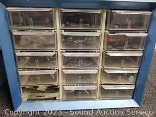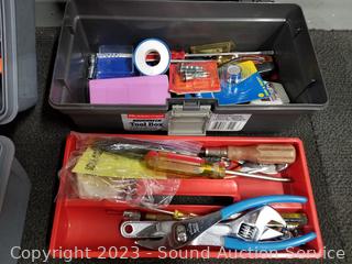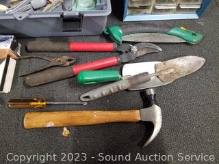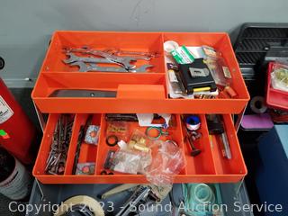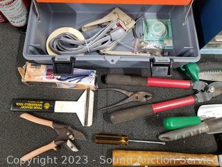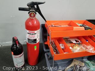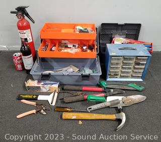 Rubbermaid 12" toolbox with tools, Flambeau 18090 17" toolbox with tools, Kiddie fire extinguisher, lawn & garden hand tools, hardware organizer. Refer to photos for more info.