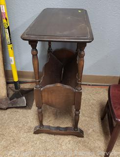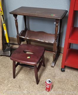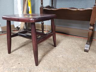 12" H x 12" x 12.5" step stool, 25" H x 23" x 11.5" reading side table. Some wear from use.