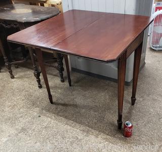 Top flips up and swivels to double the area. 31" H x 32" x 16" to 32". Some scuffs, wear to finish.