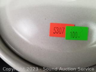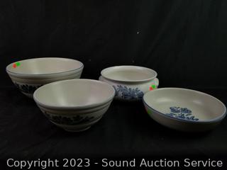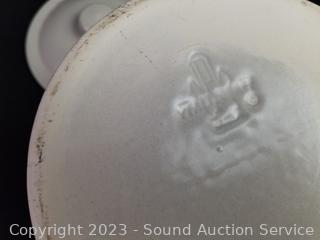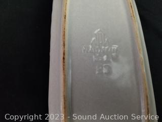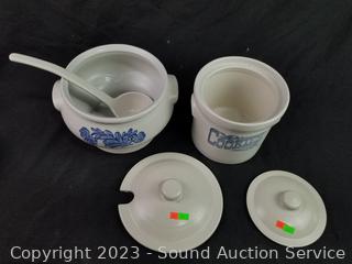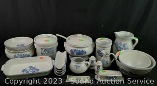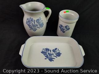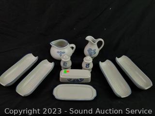 Salt, pepper, butter dish, 4 corn cob dishes, 8" x 12" baking dish, gravy boat, pitcher, (2) 8 serving bowls, 8" to 10" mixing bowls, soup tureen, cookie canister, utensil canister.