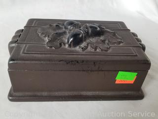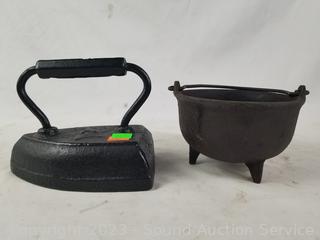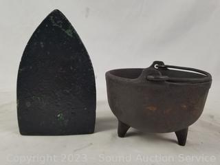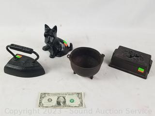 4.5" footed cauldron, 5.5" Scotty dog, Geneva 7lb Sad Iron, Cast Iron Acorn trinket box.