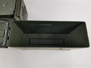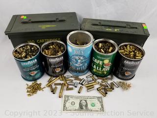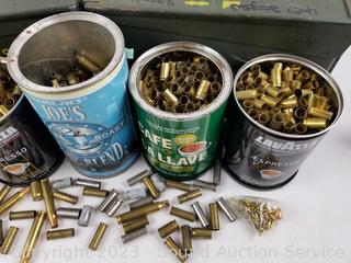 Coffee cans all full of 9MM, tins are empty, some 30-06 & other ammo. 7" H x 6" x 11.75" & 7" H x 10.75" x 3.75" tins.