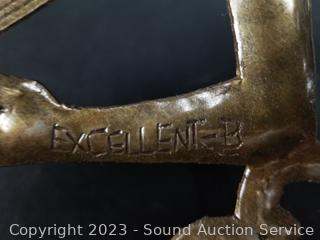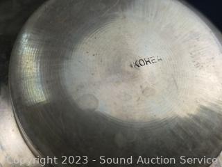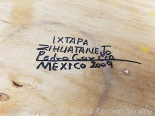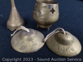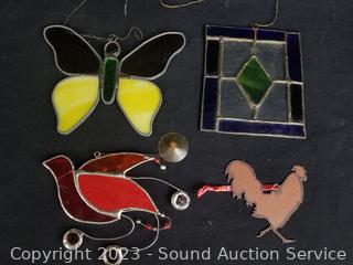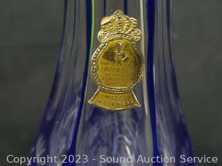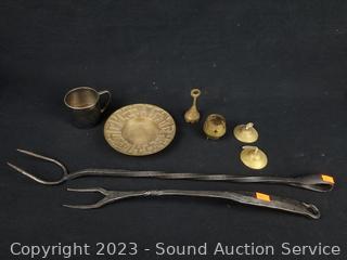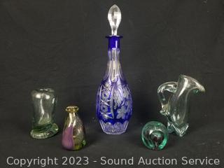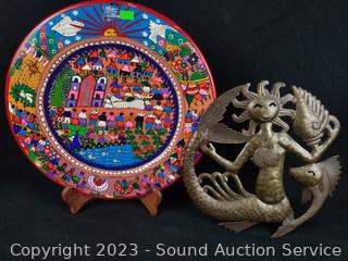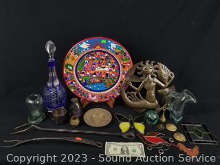 Imnperlux Germany blue cut to clear crystal decanter, art glass, hand painted Mexico wood charger, wrought iron tongs, signed metal art mermaid, stained glass, brass bell, dish.