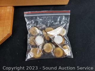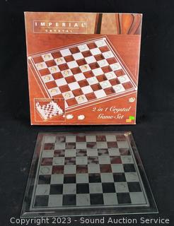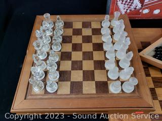 Crystal set missing half of the checkers, chess set complete. Others appear complete.