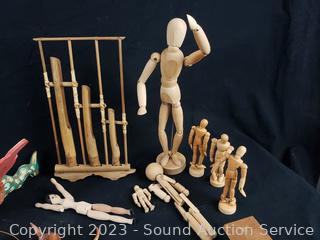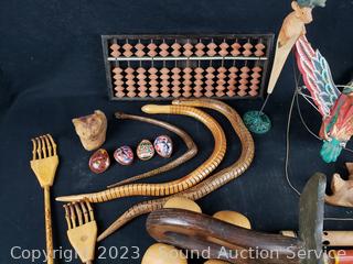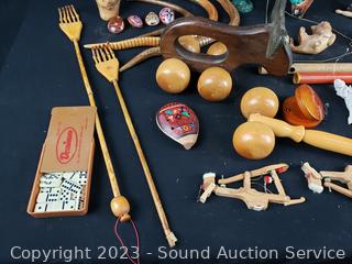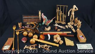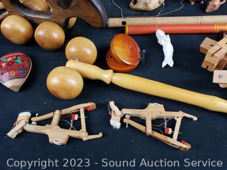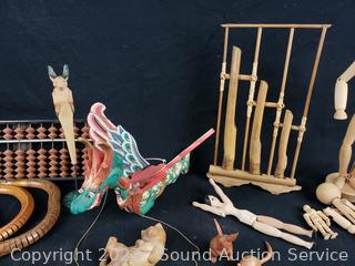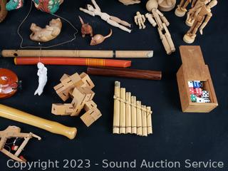 Abacus, articulating figure, flutes, puzzle, figures & more. Refer to photos for lot contents.