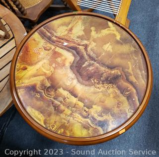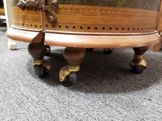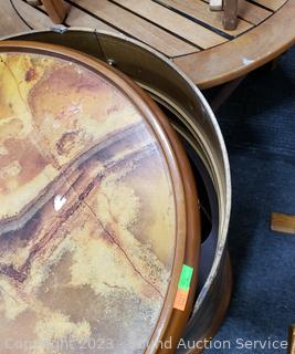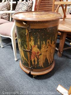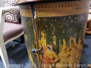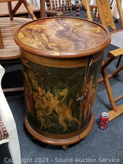 Roman/Greek scene print, adjustable shelves. Spreads open and removable top. Some scuffs, wear to finish. 29" H x 19.5" Dia.