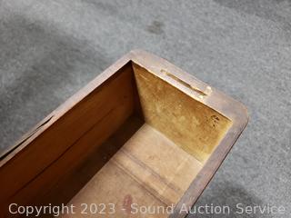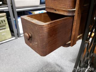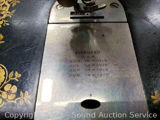 Belt is loose otherwise appears to be functioning as intended. Last patent date is Aug. 10, 1915. Quarter sawn oak cast iron treadle cabinet. Some minor scuffs, wear to finish, olde patina finish. 30" H x 35" x 17".