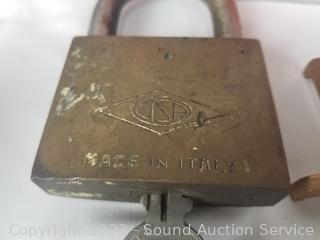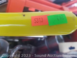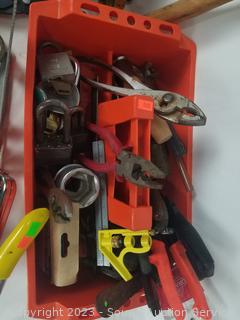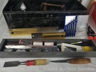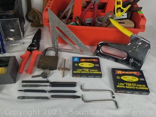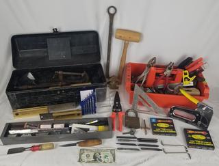 19" steel toolbox, 16" tote. Padlocks, metal snips, staple gun, "C" clamps, Swanson Speedline tools, wood mallet & more. Refer to photos for lot contents.