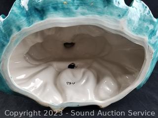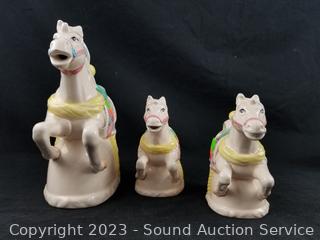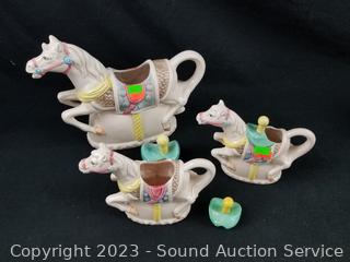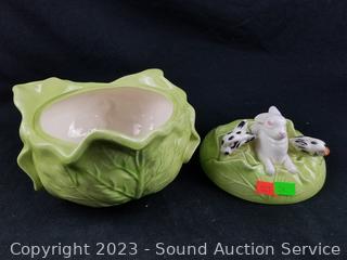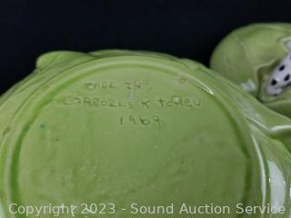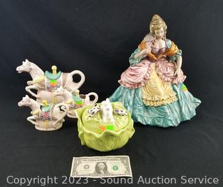Cabbage bowl has a crack, marked "Made in Carrol's Kitchen", Victorian figure made in Italy, 14" tall. 3pc Carousel Tea Set (cream, sugar, teapot), made in Japan.