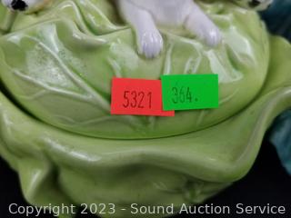 Lot #0364: Victorian Lady Ceramic Figure, 3pc Carousel Tea Set & Cabbage Bowl