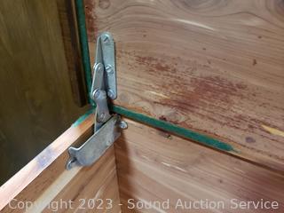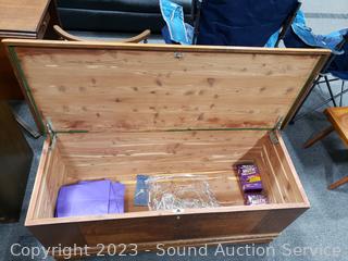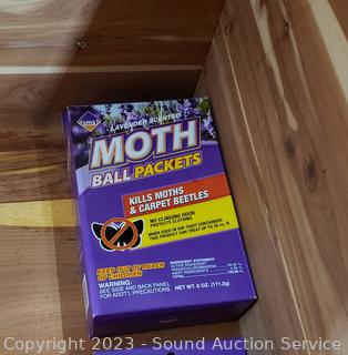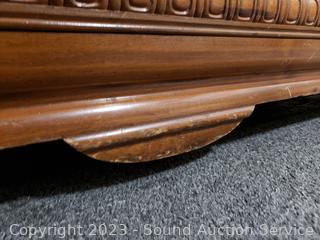Comes with 4 storage bags & 2 boxes of moth balls. Locking with key. Mahogany burl veneer finish. 21" H x 45" W x 18" D. Various scuffs, scratches, wear to finish.