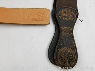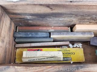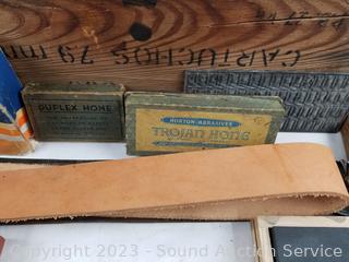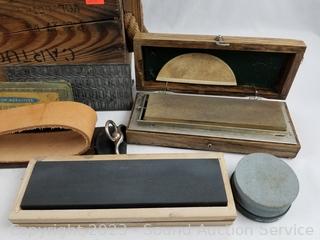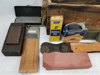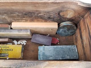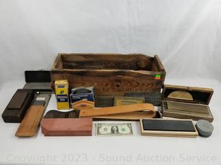 Lot #0201: Wood Crate Full of Honing Stones & Strops