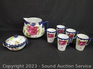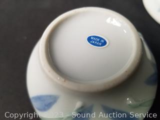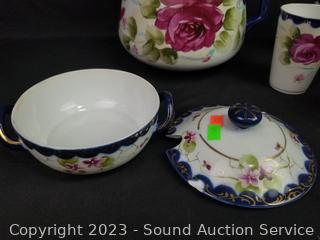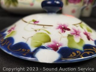 6pc Nippon Pitcher, 5 cups, covered dish (lid has a chip), 5pc Japan marked 4 cups & teapot, high relief. Don't see any other issues.