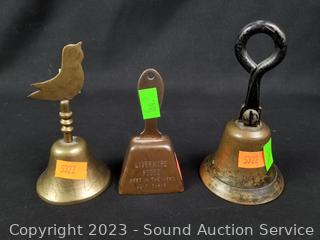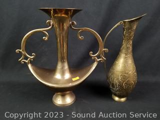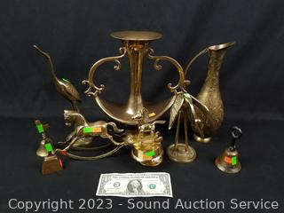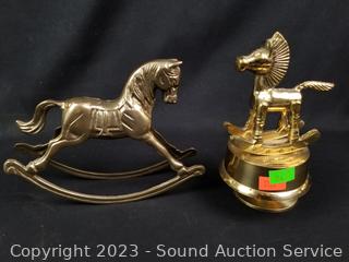 Rocking horses, etched pitcher, vase, crane, bells etc. Refer to photos for lot contents.