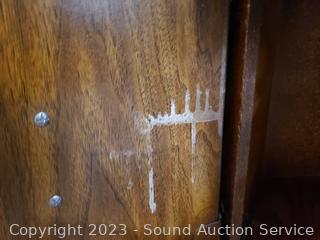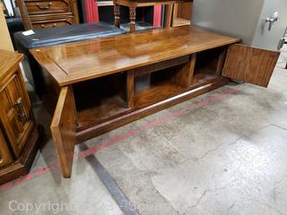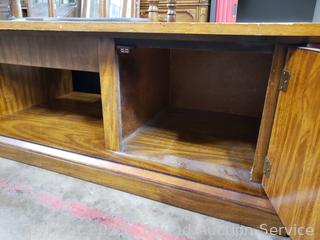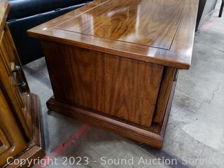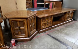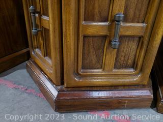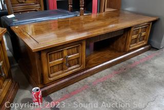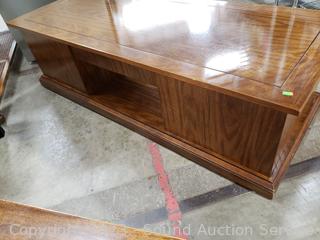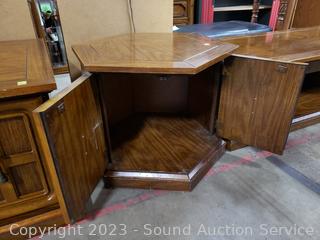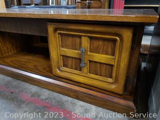 Coffee Table 16.5" H x 59.5" L x 23.5" with lower cabinet on each end. Side table 20.5" H x 23.5" Dia with lower cabinet. Both matching & Match the next lot. Some scuffs, wear to finish.
