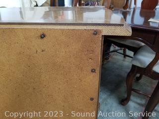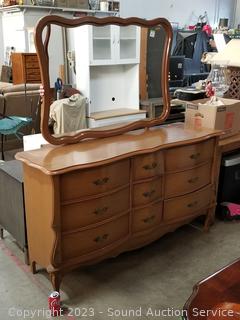 Appears to be solid wood construction, dovetail joinery. Some scuffs, wear to finish. Center top drawer has no supports, so falls into place. 34" H x 60" x 18" D with 31" x 46" mirror.