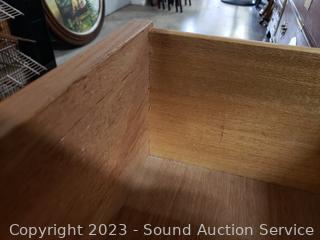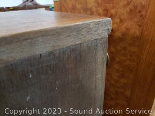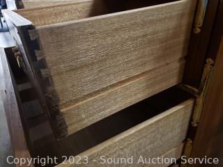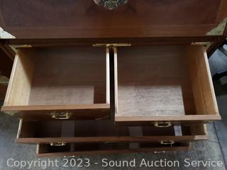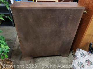 Solid wood construction, brass accents. Some minor scuffs, wear to finish. Overall great condition. 42" H x 35.5" W x 18" D.