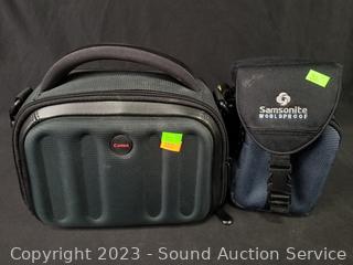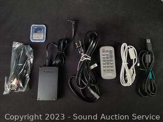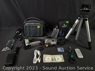 Come with various cords, tripod, camera bags. Both appear to be functioning as intended.