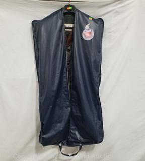 Don't see any major issues or a size. 33" long, 18" wide shoulders, 20" outer arm, 17" inner arm. Comes with 1972 Olympic games wardrobe bag.
