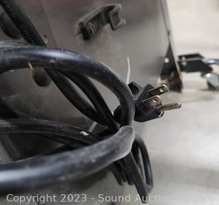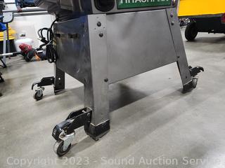 Lifting casters for easier movement. Signs of wear from use. 38" H x 58" x 34" overall.