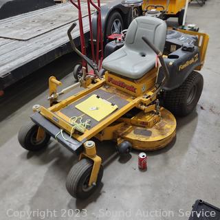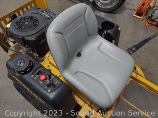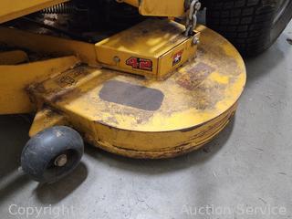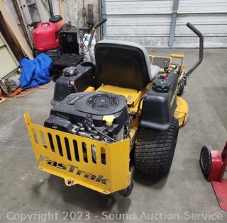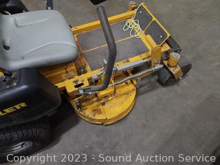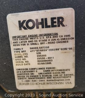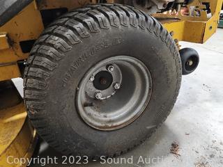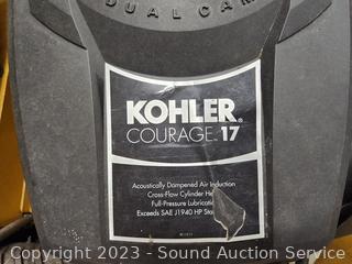 Various weathering, wear from use. Battery is shot, was able to use another battery to get it running, appears to be working as intended. Approx. 40" cutting deck. Kohler Courage 17 535cc engine.