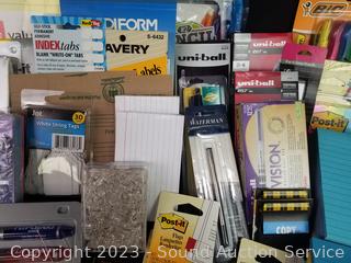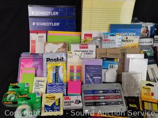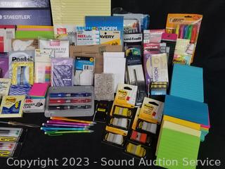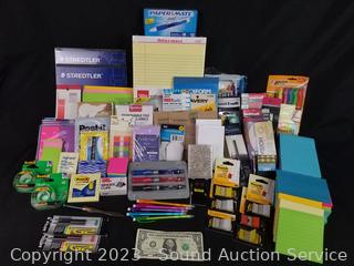 Pens, highlighters, note cards, binder clips, post-it notes, Bon blue grid paper.