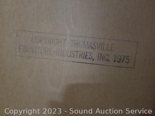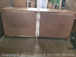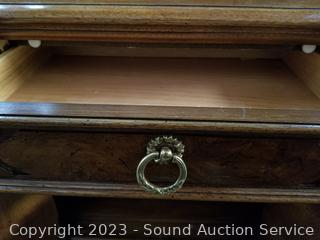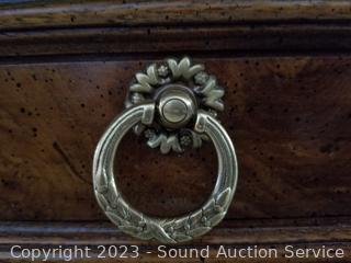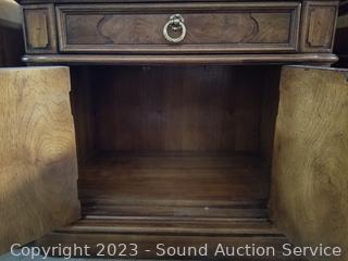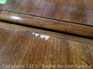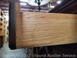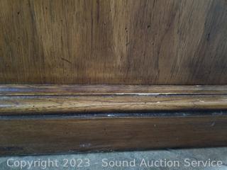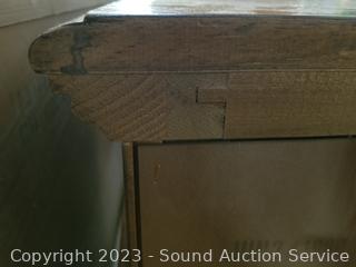 25" H x 28" W x 17" D. Some scuffs and wear to finish, more so on one than the other. Appears to be solid wood construction, dovetail joinery.