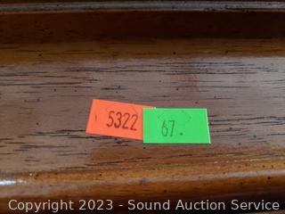 4 glass shelves with plates grooves, oak finish. 76" H x 25" H x 11.5" D.