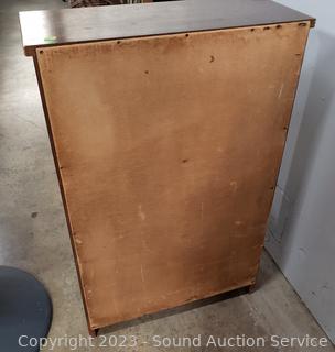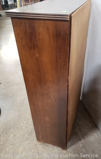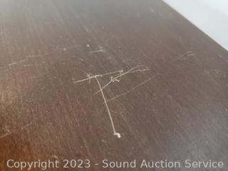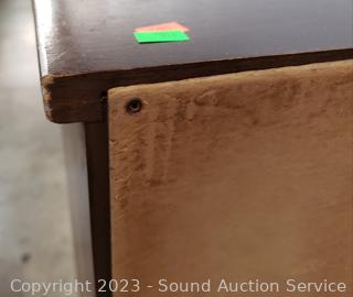 Various scuffs & wear to finish. Appears to be solid wood construction. 37" H x 24" W x 10" D.