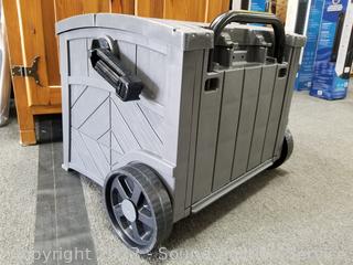 Holds up to 150ft of hose. One wheel comes off, broken piece that holds it on. 18" H x 19.5" W x 18".