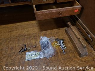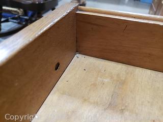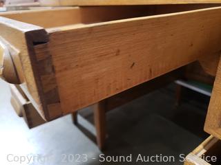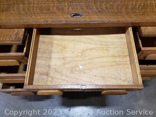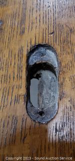 Skeleton key locks, no key, may be in a drawer, I could not get the side drawers open, the roll top is off its track, may need to be opened properly to unlock drawers, not sure what the trick is to get the drawers open. Not assembled properly, needs some one more skilled in furniture repair to assemble & repair it. Left side that holds track is loose. Comes with matching chair. 43" H x 50" W x 32" D.
