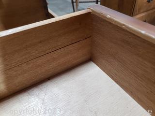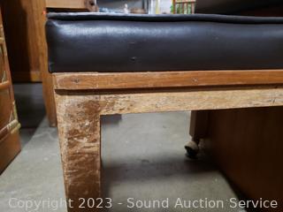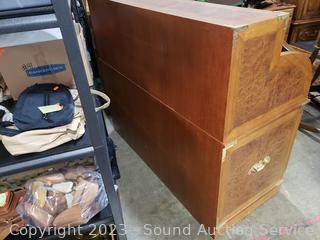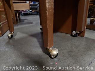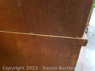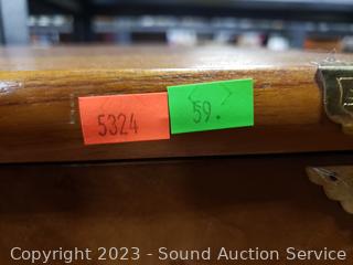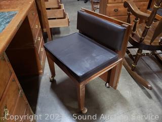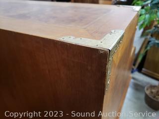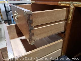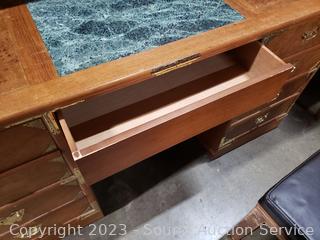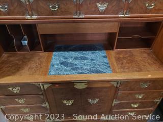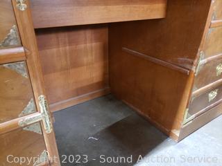 Middle section hides a chair that pulls out, various scuffs on the side and legs from use. Appears to be solid wood construction, brass accents. Works surface has various scuffs & scratches. Overall good condition. 50" H x 59" W x 26" D.