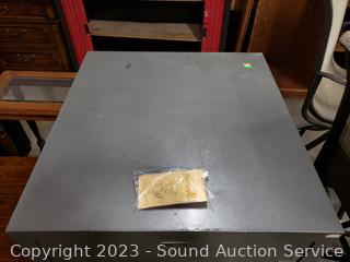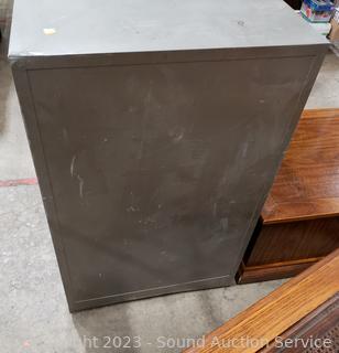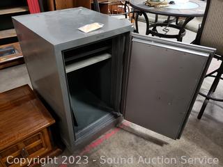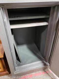 Comes with combination, combo key & instructions. 2 adjustable shelves. Some scuffs, scratches in finish. 41" H x 25" W x 27" D.