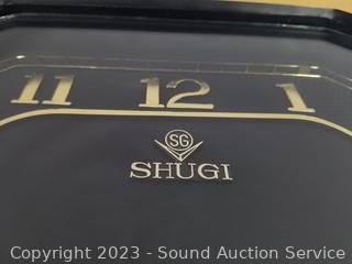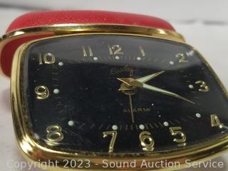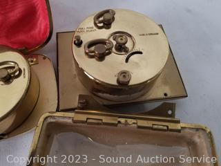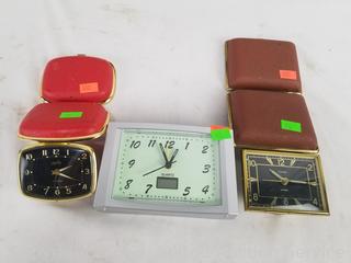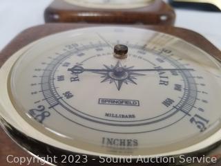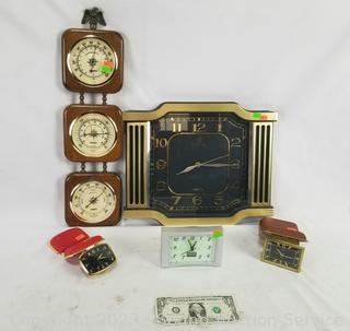 Shugi quartz wall clock, 12" x 14.5", works. Bradley Mechanical travel alarm clock, works. Florn travel alarm clock, missing a screw in hinge, works. Quartz alarm clock, (untested). Springfield Barometer/Thermometer/Hygrometer.