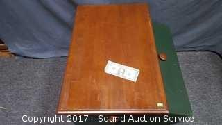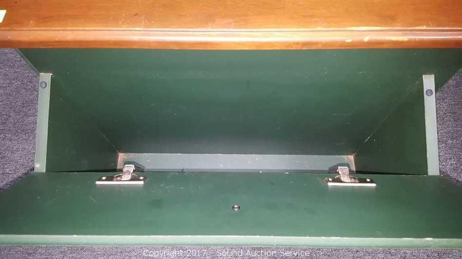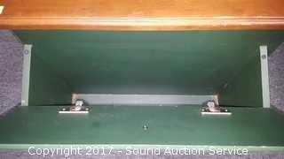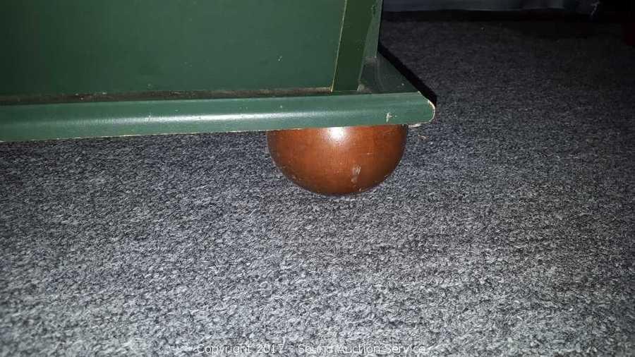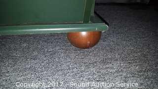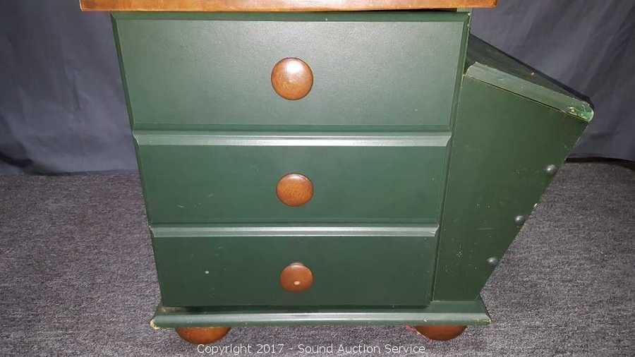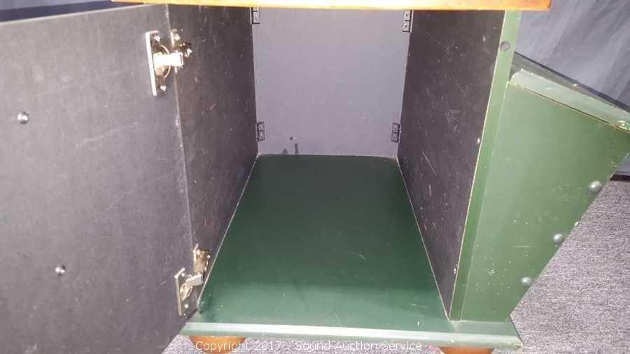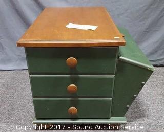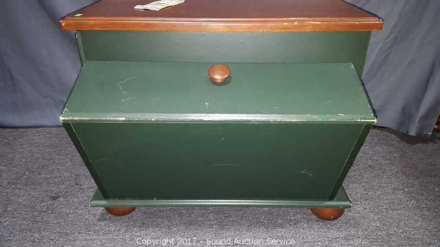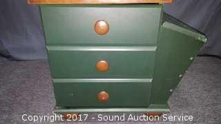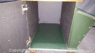 Green painted wood grain finished top. Has a cute lidded cubby on the side. Approx. 21" tall, 23" wide and 27" deep.