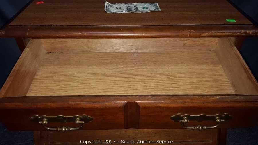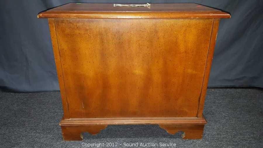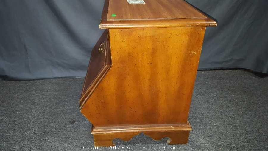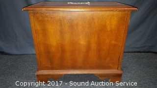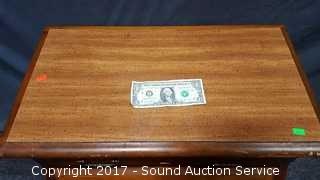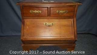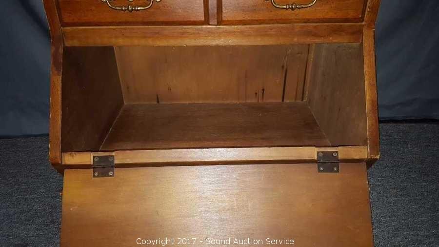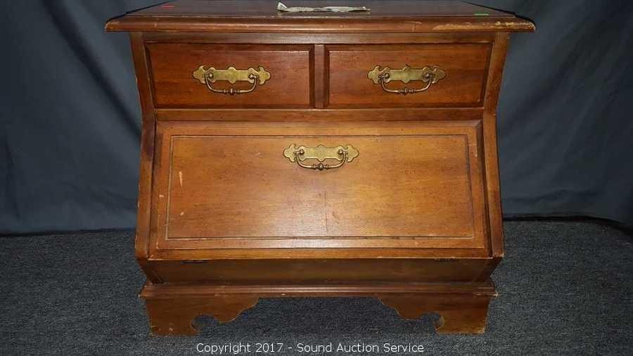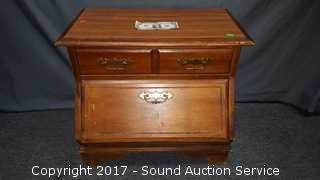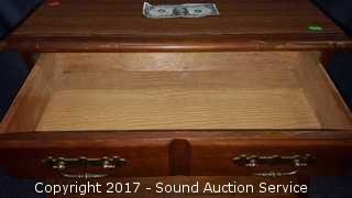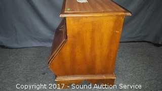 Has unique drop front cubby. Looks to be solid wood construction, some slight scuffing on the edge. Approx. 21" tall, 25" wide and 18" deep.