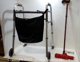 Lot #0039: Walker w/Storage Pouch, Cane & Umbrella