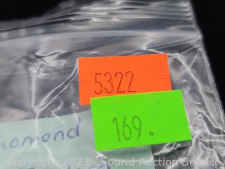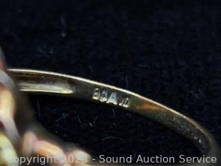 Size 5. Jewelry mark is a bit worn, believe it says 10k, held on 10k acid test, faded but stayed on 14k. Stones tested diamond. TW:2.56g.