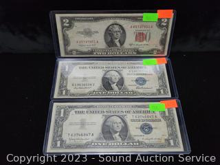 Lot #0149: 1957B & 1935F $1 Silver Cert. & 1953B $2 Red Seal Note