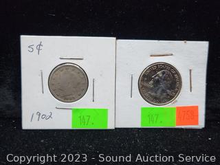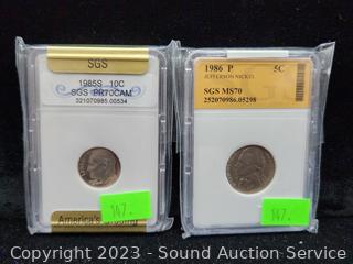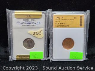 1985S 10c PR70CAM, 2005D 10c MS70TN, 1963P 1c PR70, 1986P 5c MS70, 1902 V-Nickel, 2005 Kansas 25c. ATTN: We are not coin or currency experts or graders, please use your own judgement when bidding.