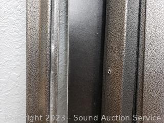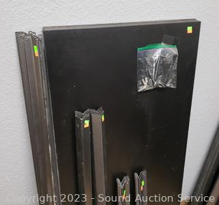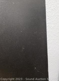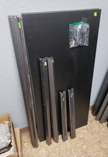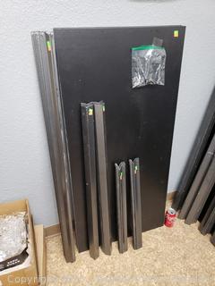 6ft H x 48" x 24". Particle board laminate shelf, signs of wear from use. Missing one of the connector pieces for vertical supports. Unassembled.