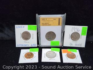 Graded 1993P 25c MS70, 2005 Detached Leg 5c Error, 1936 Buffalo Nickel 3/4 Horn Error, 2005 Buffalo Nickel, 1975 & 76 Pennies. ATTN: We are not coin or currency experts or graders, please use your own judgement when bidding.